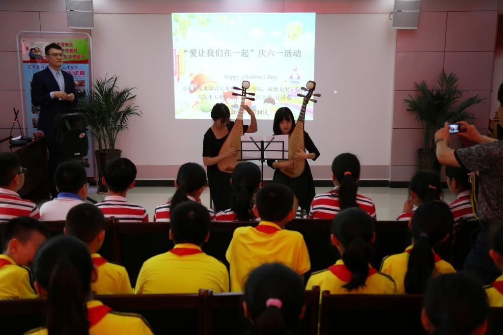 “我听见雨滴落在轻轻草地,我听见远方下课钟声响起……”5月30日下午,安庆市大观区高花亭社居委未成年人公司里乐声悠扬掌声阵阵,由音乐黄梅剧艺术公司与安徽省辅导员名师工作室敬敷女生工作坊组织的20余名志愿者走进该社区居委会,正在和那里的孩子们一起开展“爱让我们在一起”主题庆六一活动。