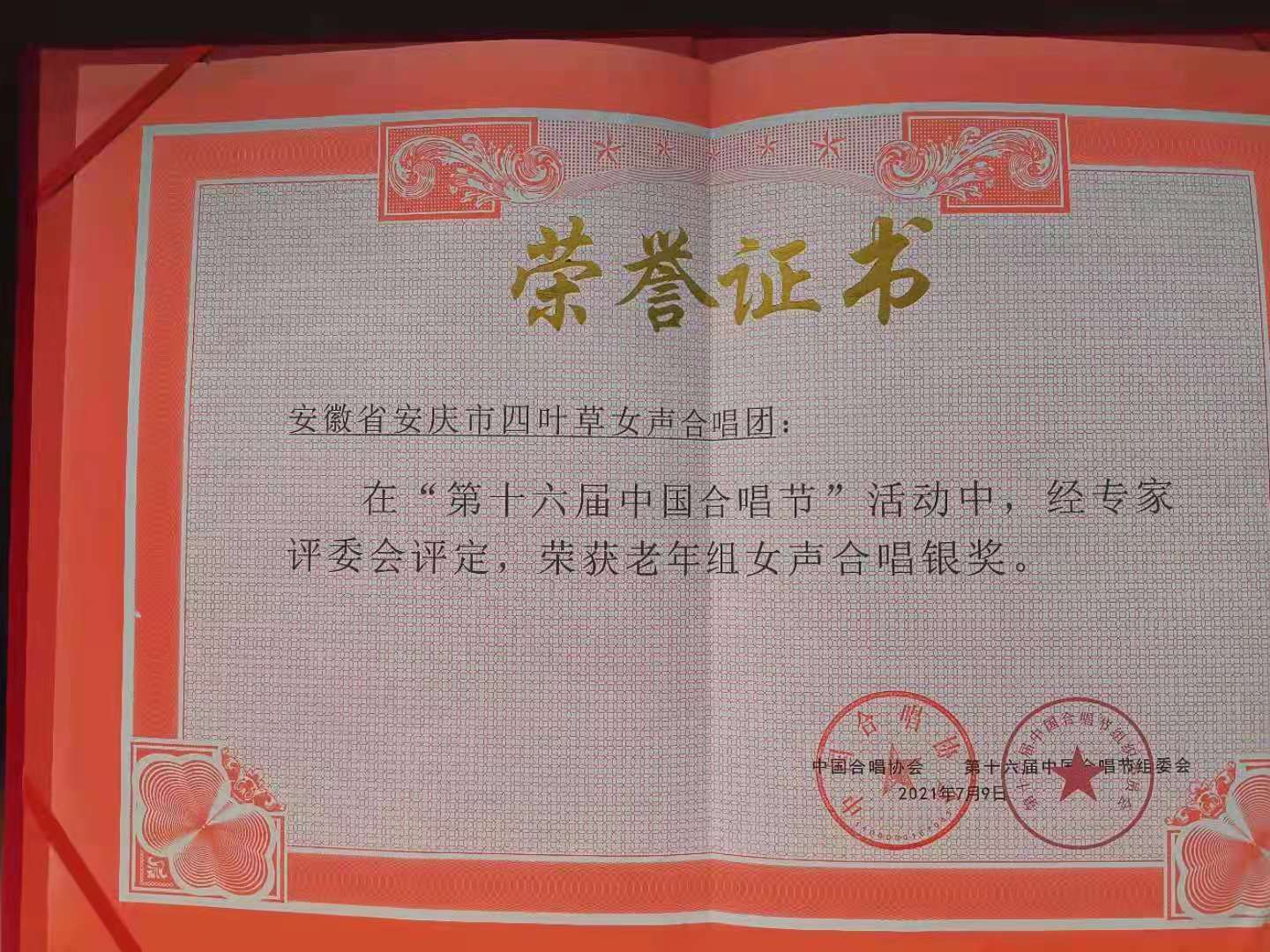 2021年7月5日至9日,以“颂歌献给党 启航新征程”为主题的第16届中国合唱节在湖北武汉市拉开序幕,来自全国20余省、市的82支合唱团,近5000人围绕比赛主题,高歌党的百年辉煌。太阳集团122cc陈燕翔老师担任指导老师和合唱指挥的“安庆四叶草女声合唱团”在此次比赛中荣获老年组女声合唱银奖第一名。