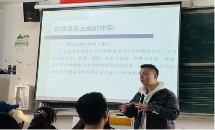 11月15日下午,公司教师陈星源在艺术楼B105教室进行《歌曲写作与改编》课程的教学观摩课。公司党委书记李新建、副书记肖之进、副经理徐冉、各教研室主任、课题组成员及青年教师前来观摩。
