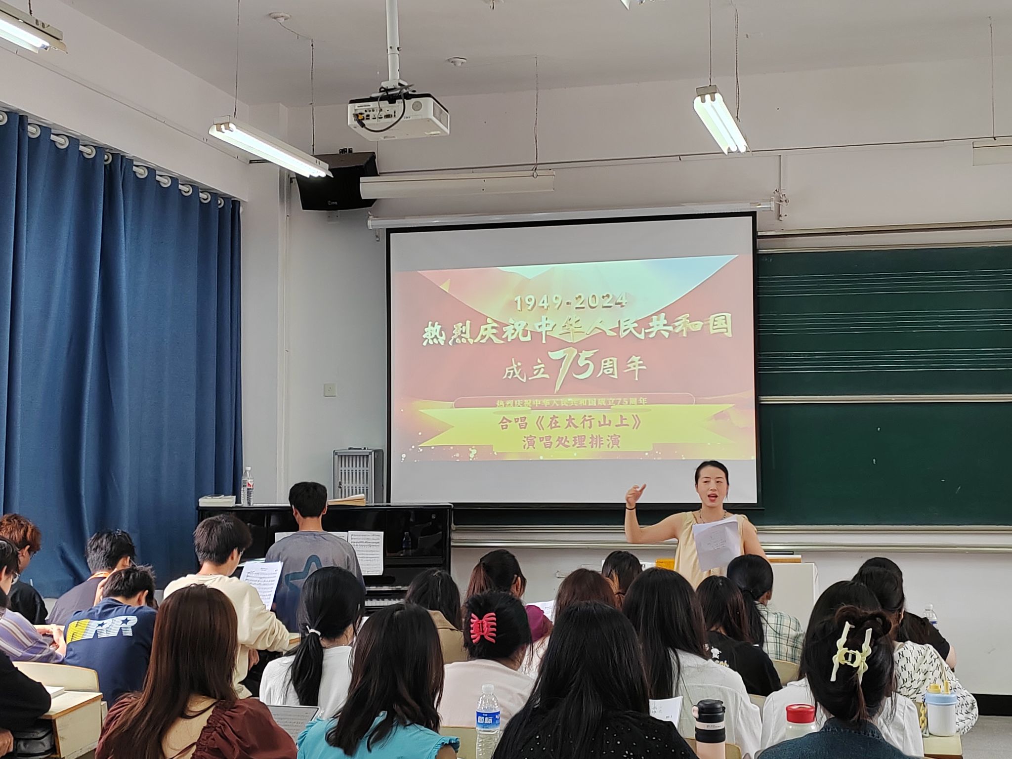 9月26日上午,音乐学2023级1、2班在艺术楼教室举办庆祝新中国成立75周年主题团日活动,全体同学在王光丽老师的指挥下,合唱《在太行山上》。歌声响起,同学们仿佛穿越时空,回到了那段波澜壮阔的岁月。《在太行山上》将充满朝气的抒情性旋律同坚定有力的进行曲旋律有机地结合在一起,歌曲既充满战斗性、现实性,又革命浪漫主义的瑰丽色彩。歌曲描绘了太行山里的游击健儿的战斗生活和勇敢顽强、乐观开朗的性格。这首充满了抗日军民革命激情的旋律,使每一个中国人都肃然产生爱国主义的豪情壮志,荡漾着庄严肃穆和博大浪漫主义的民族之魂。