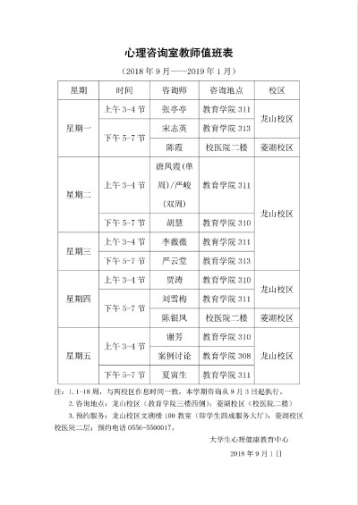 2018-2019学年第一学期心理咨询室教师值班表