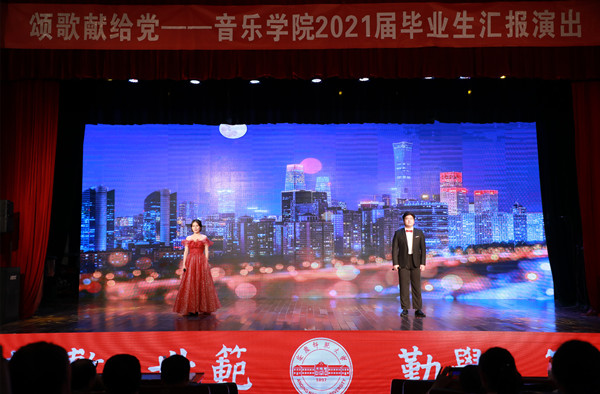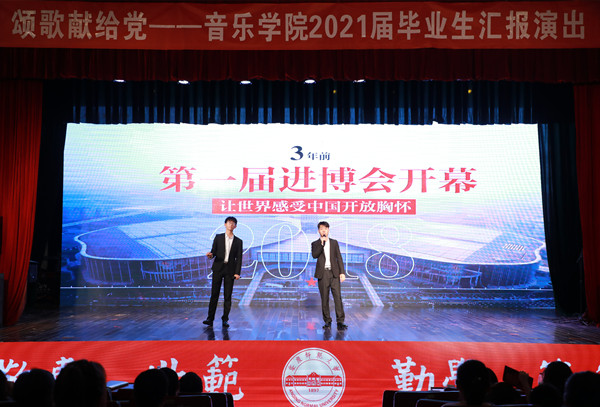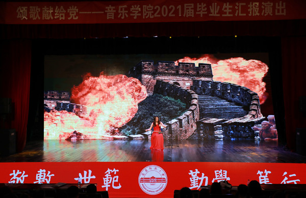 “我宣誓!我宣誓!我志愿加入中国共产党……”晚会以入党誓词歌《我宣誓》拉开序幕, 2021届音乐学专业毕业班全体党员共同演唱。毕业生党员们胸前佩戴党员徽章,身姿挺拔,用浑厚洪亮的歌声动情地传达对党的一片赤诚之心,赢得现场阵阵掌声。