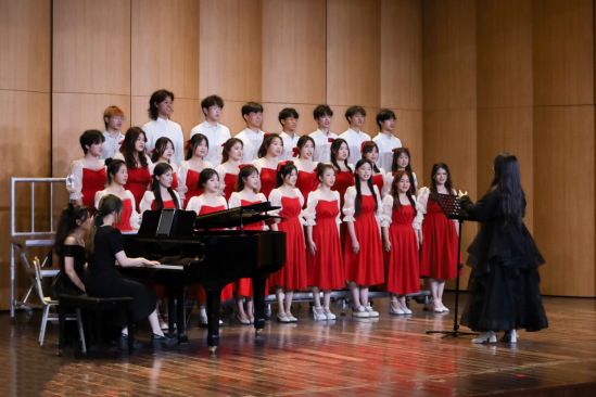 高扎的马尾、鲜红的发饰、洁白的衬衫……音乐学专业2022(4)班合唱团同学整齐的服装让人眼前一亮。随着乐曲的律动,演唱者们摆动身体,挥舞着手中的国旗,以饱满的精神状态唱出对祖国的热爱,富有感染力的表演将全场氛围推向高潮。