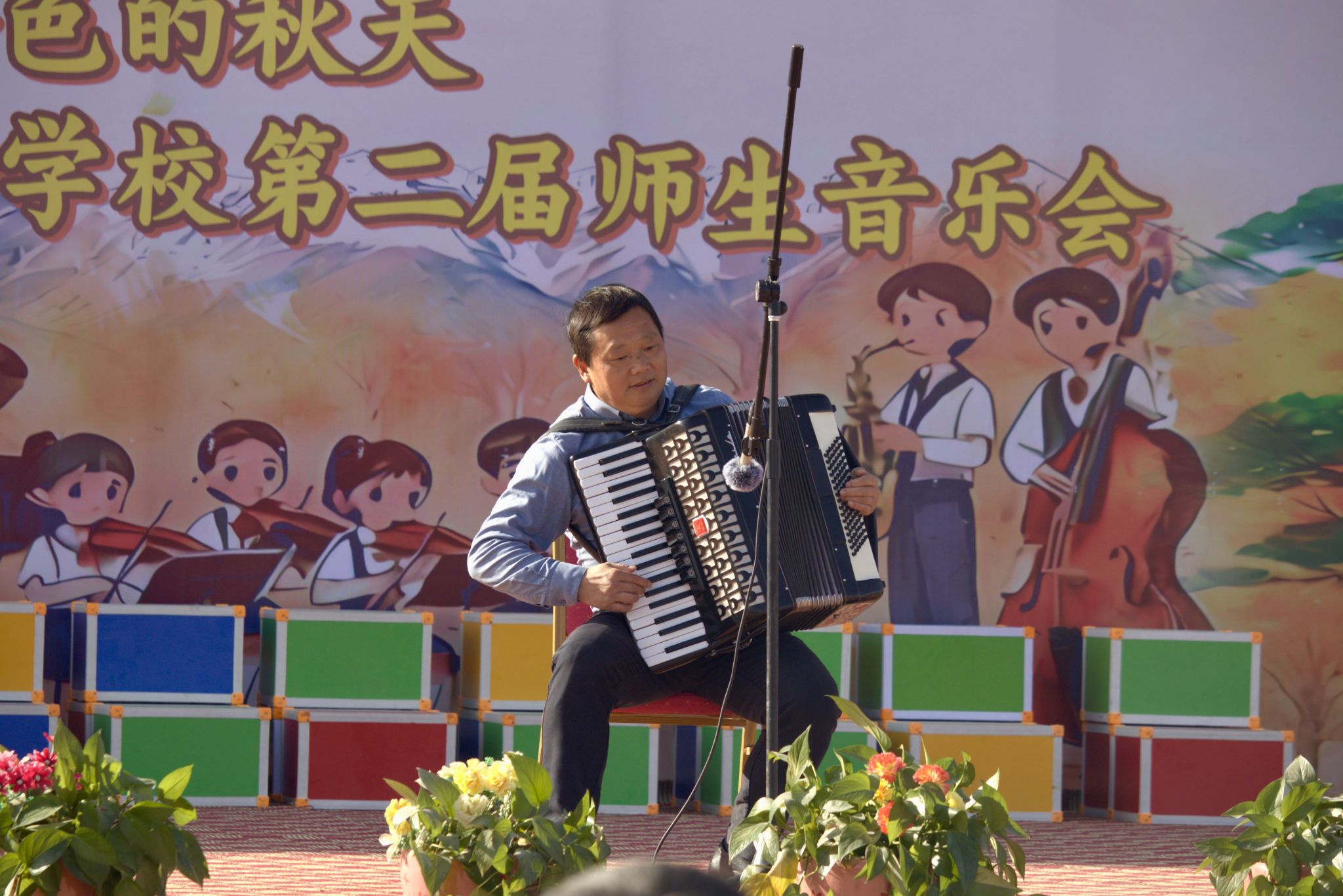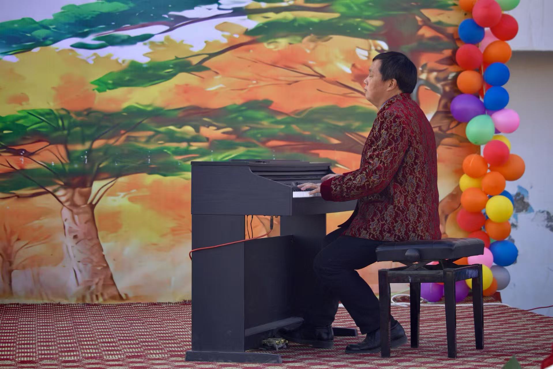 援疆支教指导教师、副经理彭传山先后演奏了手风琴和钢琴作品。手风琴曲《新疆民歌联奏》轻快活泼,熟悉的旋律响起,现场即报以热烈掌声;钢琴独奏《保卫黄河》则以磅礴气势奏响黄河壮歌,将现场爱国热情推向高潮。
